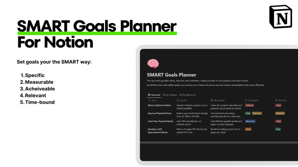 The SMART Goals Planner Notion Template is your ultimate tool for turning vague aspirations into actionable, trackable goals.